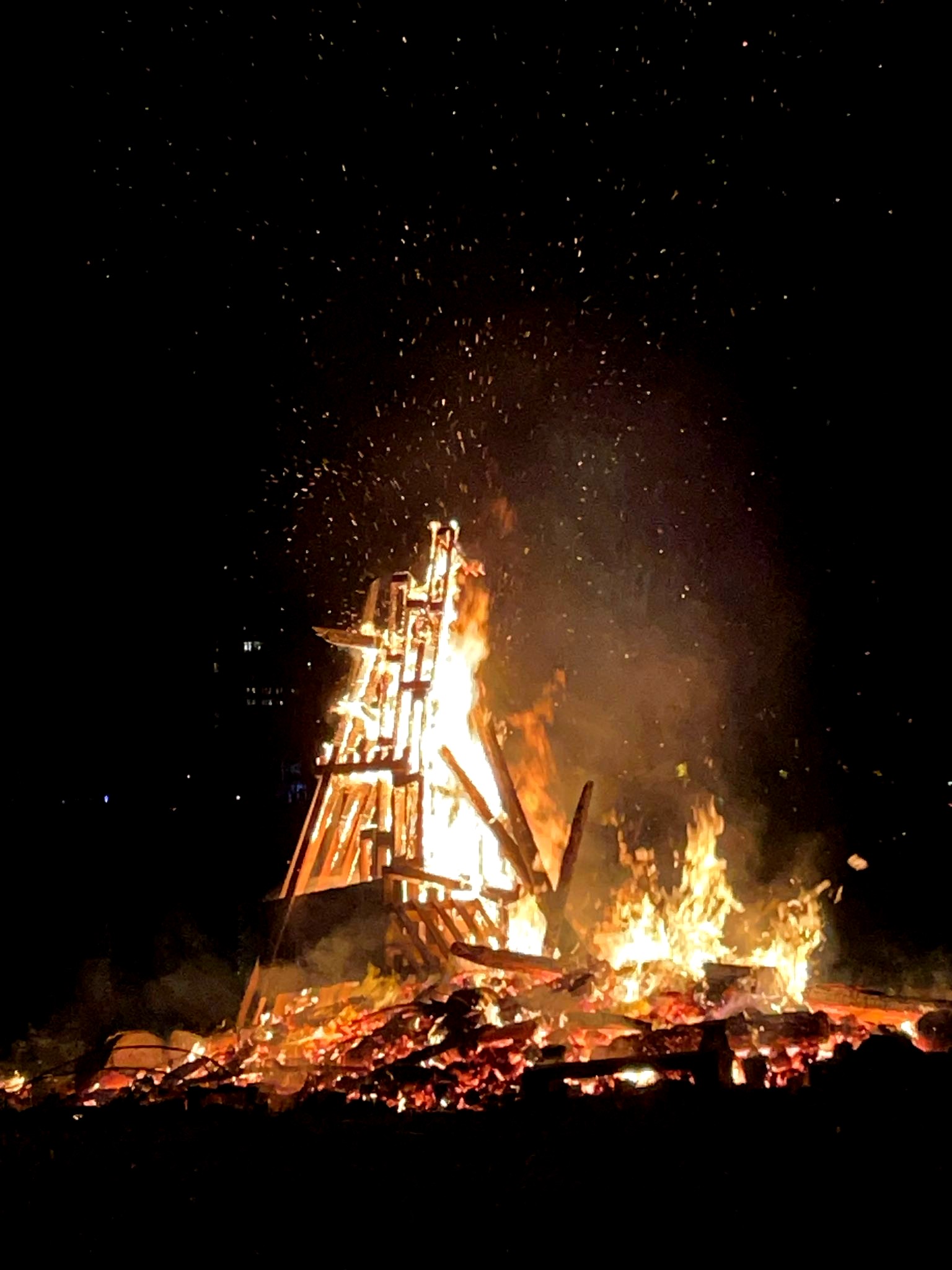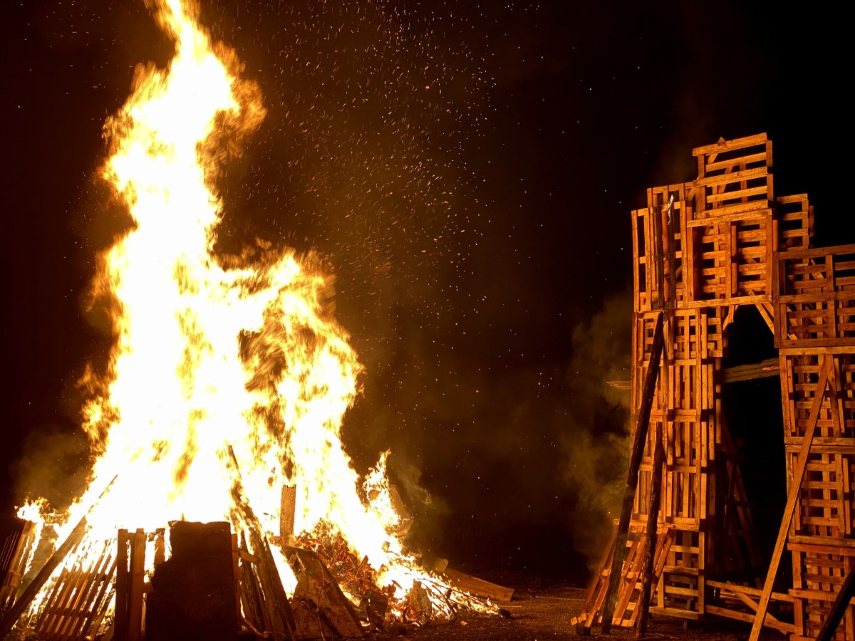 Die Flammen lodern 6 bis 10 Meter hoch und verleihen dem Abend eine besinnliche Stimmung